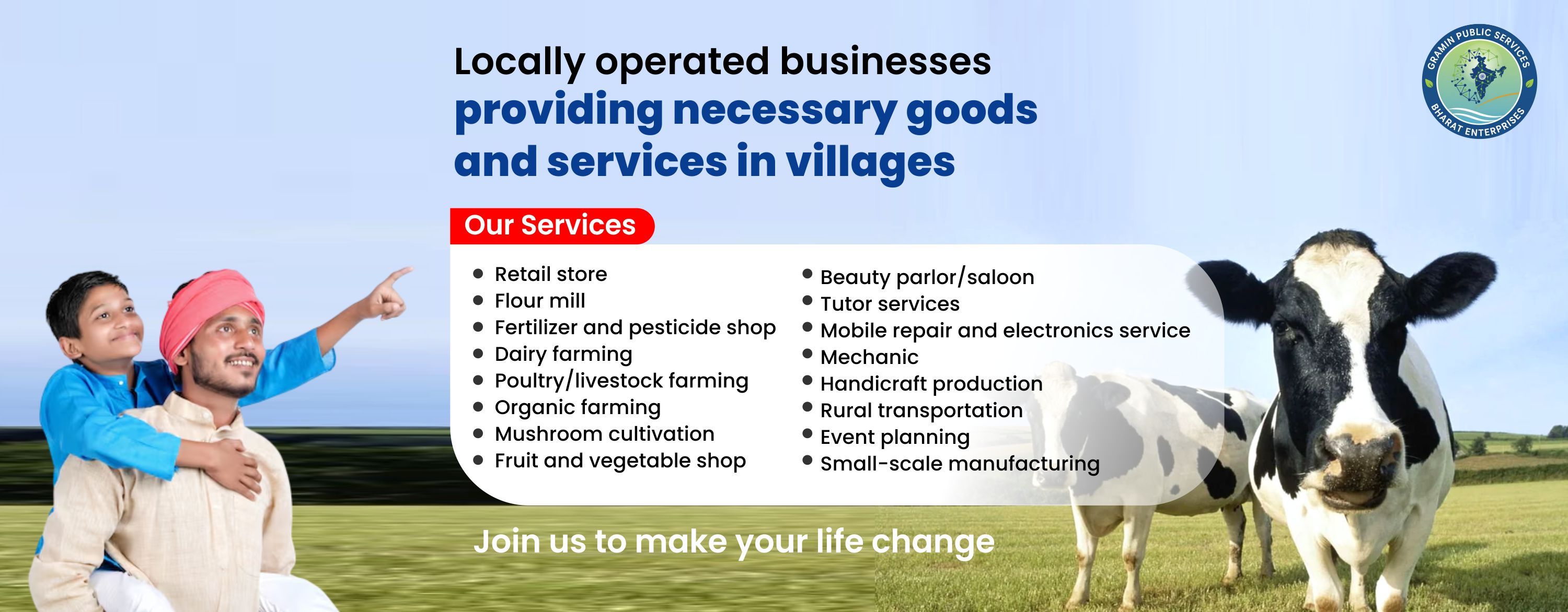 Gramin Public Services Bharat Enterprises promotes small and sustainable business opportunities designed for rural areas. Our goal is to enable villagers to start income-generating ventures that meet local needs, create employment, and strengthen.